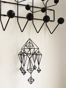 Himmeli 1 is handmade by me. As a handmade item it is delicate and one of a kind. It is made of black plastic straw and cotton string.